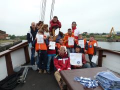Mit großer Vorfreude reisten die Kinder vormittags in Lübeck an und begrüßten gemeinsam mit den Betreuern den Kapitän Lutz sowie den Bootsmann Peter. Sogleich nahmen die Kinder das Schiff in Beschlag. Es handelt sich um die 130 Jahre alte Galeasse „Fridthjof“, die mit ihren 32 Metern Länge zu den bekanntesten Traditionsschiffen Lübecks gehört.