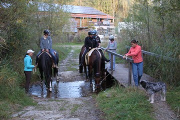 Wie schon bei den beiden ersten Familienaufenthalten in den Pfingstferien, wurden die Stunden bei den Pferden von Anke Gartner und ihrer Kollegin Christiane Probst von allen Gästen sehr geschätzt. Gemeinsam putzten, streichelten und sattelten sie die Pferde, um anschließend durch den Wald und über die Wiesen spazieren zu gehen.
